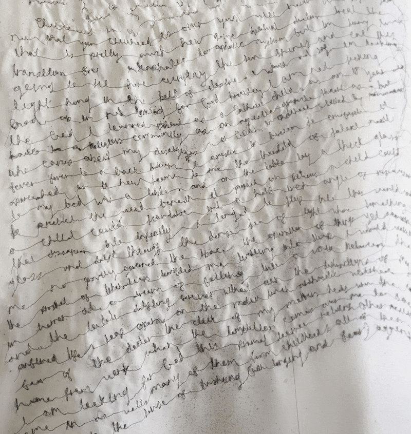Combining paper embroidery with printmaking to create this piece/ new process. I, backwards and upside down, hand embroidered phrases into paper, which I transfered with ink onto paper.